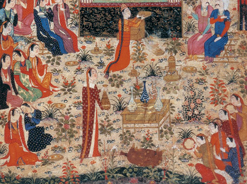 庭院筵席局部。1396年制品,倫敦大英圖書館藏。圖中木桌上擺設著作為容器使用的玉壺春瓶