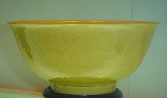 康熙蛋黃釉暗刻龍紋碗