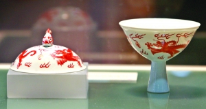 同為宮廷用具,為什么有的是全黃?有的只有一點黃?有的一點黃色都沒有?周玫神秘一笑,她帶著記者轉(zhuǎn)了一圈,“這個黃釉盤是全黃釉的,為皇帝、皇后、皇太后專用。這個盤乾隆皇帝曾經(jīng)用過,而這個外黃釉內(nèi)白釉盤,則是皇貴妃用的。再看這個黃地素三彩花卉云龍紋盤,是康熙的貴妃、妃子們用的,還有這個青花地黃彩云龍紋碗,是妃嬪們用的。”