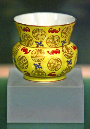 黃地粉彩描金福壽無疆紋渣斗