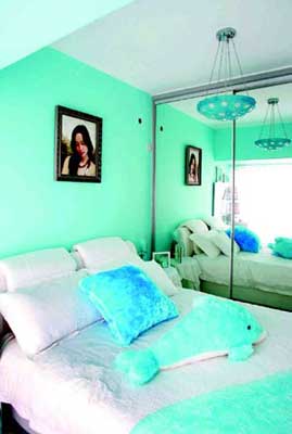 藍(lán)色主臥室,讓最平淡的日子也香艷起來,香艷這個(gè)詞,在古時(shí)候也是用來形容女子閨房的。不過,顯然,現(xiàn)代的香艷才是更符合它的字面意義的。所謂艷,即明艷。強(qiáng)調(diào)的是色彩,并且是濃烈而明亮的色彩,愛琴海一般的冰藍(lán)、山茶花一樣的純紅、檸檬原色的明黃,以及泛著光彩的亮白,只有春天的水果和鮮花的顏色才有資格被一一臨摹。而香,則和那一抹存在于四周卻不得描摹形狀的溫馨氣味一樣,不是一盞冰藍(lán)的水晶燈,或者一套淡綠的茶具、一雙亮紅的塑膠拖鞋,而是這些所有細(xì)枝末節(jié)的總和。沒有實(shí)體,而只能借助一切精致的道具,從骨髓往外滲透的這種情調(diào),一定要給它一個(gè)稱謂的話,姑且我們可以叫它小資。