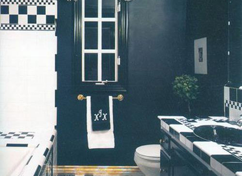 特制的瓷磚花紋賦予這間浴室的浴缸、墻壁、水池以獨特的氣質(zhì)。墻面用黑羊皮覆蓋,墻角線與天花線飾以金鎳鉑片。