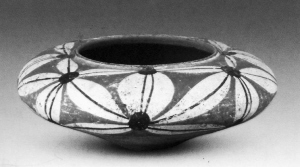 仰韶彩陶?qǐng)D案中尤其引人注意的,是分布在陜西化山附近的廟底溝類型彩陶,它們大多呈現(xiàn)出一種多方連續(xù)的美麗圖案。其制作方法是,先在器坯上安排好裝飾花紋帶的部位,然后以圓點(diǎn)排列定位,再用線或是弧形三角紋將圓點(diǎn)聯(lián)結(jié)起來(lái),組成既均衡對(duì)稱,又活躍生動(dòng)的連續(xù)圖案。仔細(xì)觀察可以看出,它們是用陰陽(yáng)紋結(jié)合的技法,來(lái)表現(xiàn)玫瑰花的覆瓦狀花冠,以及花蕾、葉子和莖蔓。