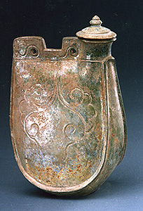 雞冠壺是遼代的典型壺式之一,摹仿契丹族使用的各種皮囊容器而燒造的,亦稱皮囊壺。因壺的上部有雞冠狀的穿孔,故稱雞冠壺。又因形似馬蹬,俗稱馬蹬壺。雞冠壺的燒制,體現(xiàn)了遼代統(tǒng)治者不忘自己是馬背上的民族,以此來提醒自己不能忘本。