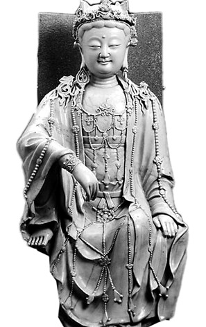 這件瓷塑像高67厘米,1955年出土于西城區(qū)定阜大街西口。菩薩像頭戴寶冠,寶冠上有小化佛,已殘。額頭寬闊,雙目微閉,端莊慈祥,氣質(zhì)高雅。右腿支起,左腿下垂,右臂放在右膝上,神態(tài)優(yōu)美,這種姿勢的觀音一般稱為水月觀音。觀音上身穿袈裟,下身著長裙,胸前及衣裙上飾聯(lián)珠瓔珞,手腕戴臂釧,全身裝飾十分繁縟。通體施青白釉,釉色白中泛青,胎質(zhì)潔白細膩。