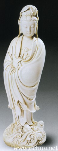 釉色白中泛黃,呈牙白色,如凝脂凍玉,滋潤瑩滑。觀音雙手藏袖,露一足踏蓮花,另一足水花掩蓋,作踏浪凌波渡海之勢。觀音神情嫻雅平靜,安詳自若,雙目低垂凝思。整座塑像精巧細致,神態(tài)如生,背鈐有“何朝宗印”方形印章款。