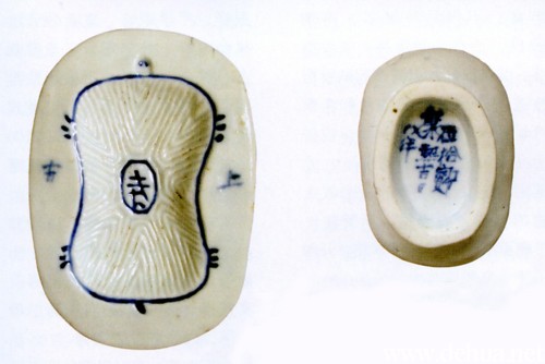 “象牙白”釉龜粿印,康熙五十八年(1719年),寬8厘米,長11.5厘米,龜粿印用青花點(diǎn)綴,釉水瑩潤,宛如凝脂,底部用青花銘有“康熙伍拾八年吉日 寶”等字樣。