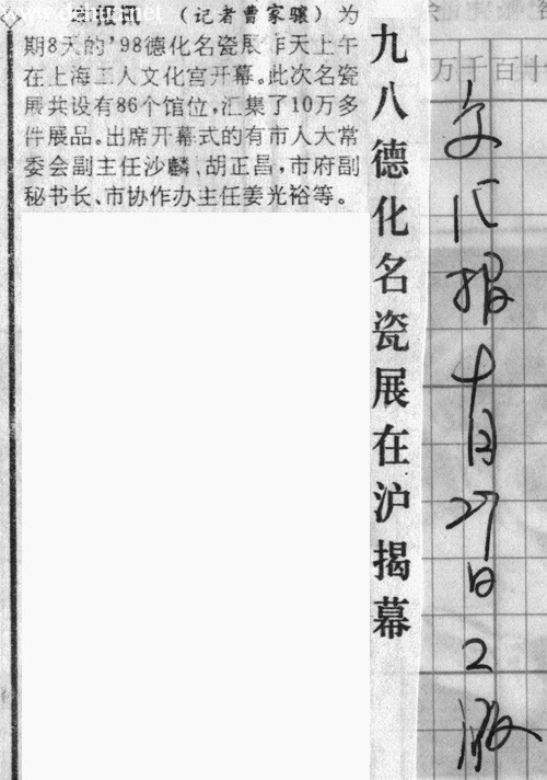 本報訊 (記者曹家驤)為期8天的’98德化名瓷展昨天上午在上海工人文化宮開幕。此次名瓷展共沒有86個館位.匯集了10萬多件展品。出席開幕式的有市人大常委會副主任沙麟、胡正昌,市府副秘書長、市協(xié)作辦主任萎光裕等。