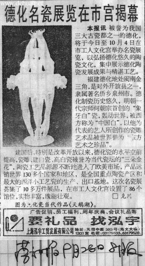 本報(bào)訊被譽(yù)為我國(guó)三大古瓷都之一的德化,將于今日至lO月4日在市工人文化宮舉辦名瓷展覽,以弘揚(yáng)德化悠久的陶瓷文化,集中展示德化陶瓷發(fā)展成果與精湛工藝。