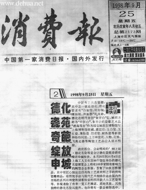 政府搭臺(tái)、企業(yè)唱戲的’98上海·德化名瓷展覽會(huì)讓德化瓷苑奇葩有緣在申城綻敬,本月26日到l0月4日在上海工人文化宮86個(gè)館位舉辦的德化名瓷展覽會(huì)上將有100多家較有影響力的陶瓷企業(yè)參展,薈集了lO多萬件展品,其中有匠心獨(dú)運(yùn)出自高級(jí)工藝美術(shù)師之手的傳統(tǒng)瓷雕精品,有傳統(tǒng)手法與現(xiàn)代藝術(shù)相結(jié)合適合國(guó)內(nèi)外市場(chǎng)的系列日用瓷和異彩紛呈的西洋款式小工藝瓷等等。參觀者除了有幸一覽工藝精湛、質(zhì)地優(yōu)良、風(fēng)格獨(dú)特的德化藝名瓷風(fēng)貌外,也許將有一款會(huì)被你選中。