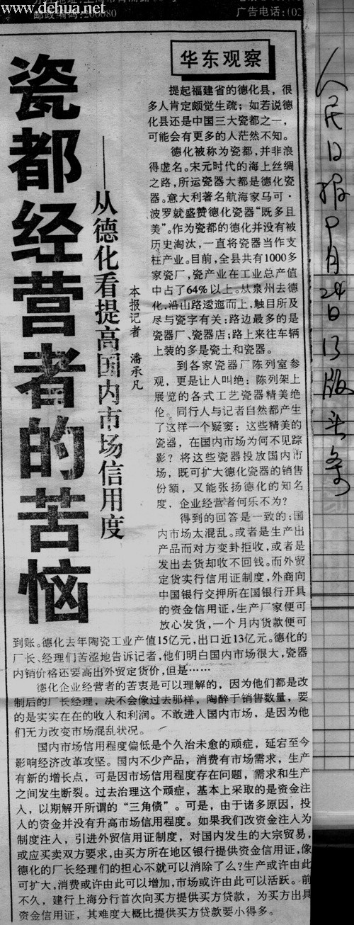 得到的回答是一致的:國(guó) 內(nèi)市場(chǎng)太混亂;蛘呤巧a(chǎn)出 產(chǎn)品而對(duì)方變卦拒收,或者是 發(fā)出去貨卻收不回錢。而外貿(mào) 定貨實(shí)行信用證制度,外商向 中國(guó)銀行交押所在國(guó)銀行開具 的資金信用證,生產(chǎn)廠家便可 放心發(fā)貨,一個(gè)月內(nèi)貨款便可到賬。德化去年陶瓷工業(yè)產(chǎn)值15億元,出口近13億元。德化的廠氏、經(jīng)理們苦澀地告訴記者,他們明白國(guó)內(nèi)市場(chǎng)很大,瓷器內(nèi)銷價(jià)格還要高出外貿(mào)定貨價(jià),但是……