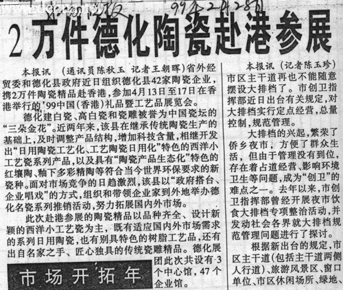 本報訊(通訊員 陳秋玉 記者 王朝暉) 省外經貿委和德化縣政府近日組織德化縣42家陶瓷企業(yè),攜2萬件陶瓷精品赴香港,參加4月13日至17日在香港舉行的’99中國(香港)禮品暨工藝品展覽會。