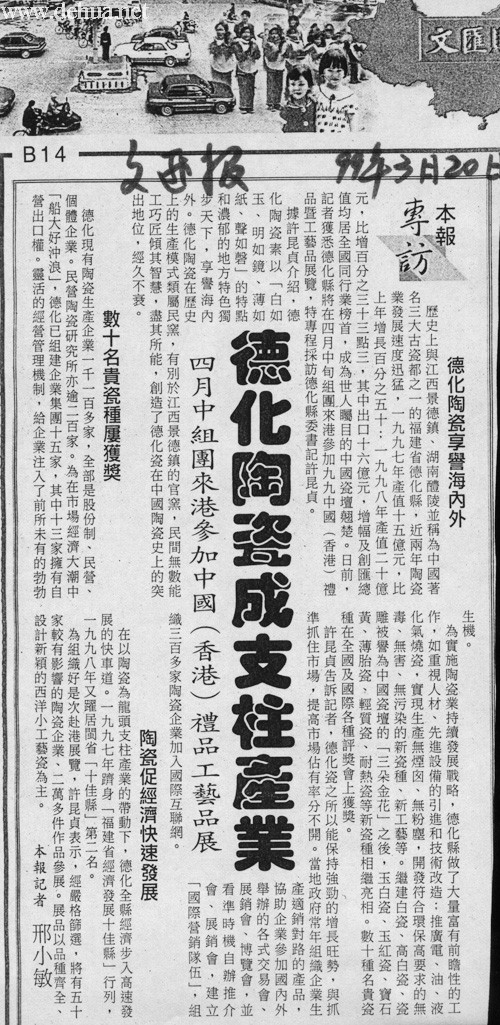 歷史上與江西景德鎮(zhèn)、湖南醴陵并稱為中國(guó)著名三大古瓷都之一的福建省德化縣,近兩年陶瓷業(yè)發(fā)展速度迅猛,一九九七年產(chǎn)值十五億元,比上年增長(zhǎng)百分之五十;一九九八年產(chǎn)值二十億元,比增百分之三十三點(diǎn)三,其中出口十六億元,增幅及創(chuàng)匯總值均居全國(guó)同行業(yè)榜首,成為世人矚目的中國(guó)瓷壇翹楚。日前,記者獲悉德化縣將在四月中旬組團(tuán)來(lái)港參加九九中國(guó)(香港)禮品暨工藝品展覽,特專程采訪德化縣委書記許昆貞。