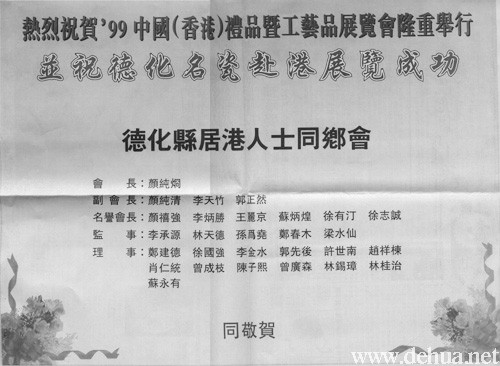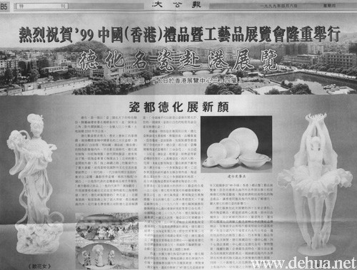 德化縣參加此次展覽的四十五家企業(yè)和二萬件陶瓷精品,都是經(jīng)過精心挑選。其中以品種齊全、設(shè)計(jì)新穎的西洋小工藝瓷為主,還有匠心獨(dú)特出自高級(jí)工藝美術(shù)師之手的傳統(tǒng)瓷雕精品,有傳統(tǒng)手法與現(xiàn)代藝術(shù)相結(jié)合的瓷苑奇葩,有適合國(guó)內(nèi)外市場(chǎng)需求的系列日用瓷,還有別具特色的樹脂工藝品、竹木草藤工藝品等等。此次展覽,德化展團(tuán)設(shè)有一個(gè)中心館,四十七個(gè)企業(yè)館。中心館立足德化全局,實(shí)物豐富,瑰麗壯觀;企業(yè)館各具特色,展示出企業(yè)各自的風(fēng)貌和創(chuàng)新產(chǎn)品。竭誠(chéng)歡迎海內(nèi)外各界朋友和香港同胞光臨此次展覽會(huì)的德化展館。同時(shí),三十萬德化人民也熱情歡迎香港各界人士和海內(nèi)外一切有識(shí)之士到德化縣觀光、旅游。