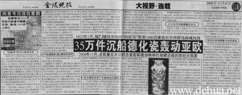 據(jù)悉,拍賣會(huì)將于今年11月17日至25日在存放瓷器的倉(cāng)庫(kù)附近搭起的大帳篷中進(jìn)行。拍賣行將把這些德化陶瓷分成若干批進(jìn)行拍賣。主辦單位稱,這是有史以來(lái)規(guī)模最大的拍賣會(huì)。