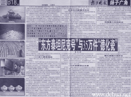 1999年5月,英國著名的海難打撈專家邁克·哈徹(Mike Hatcher),組織了一支打撈隊,經(jīng)過數(shù)月的勘探,終于發(fā)現(xiàn)這艘清朝道光年間沉沒大海的客貨商船“的星號”,打撈隊投入了大量的資金,并于去年將船打撈上來。令打撈隊伍吃驚的是,他們除了發(fā)現(xiàn)無數(shù)死難者的骸骨外,還撈獲了35多萬件中國瓷器,這是世界陶瓷考古史上最大的一次發(fā)現(xiàn),而這些瓷器全部來自中國著名瓷都福建德化。專家估計,這些瓷器是由居住印尼的中國、日本、英國、瑞典和法國富商訂購的。