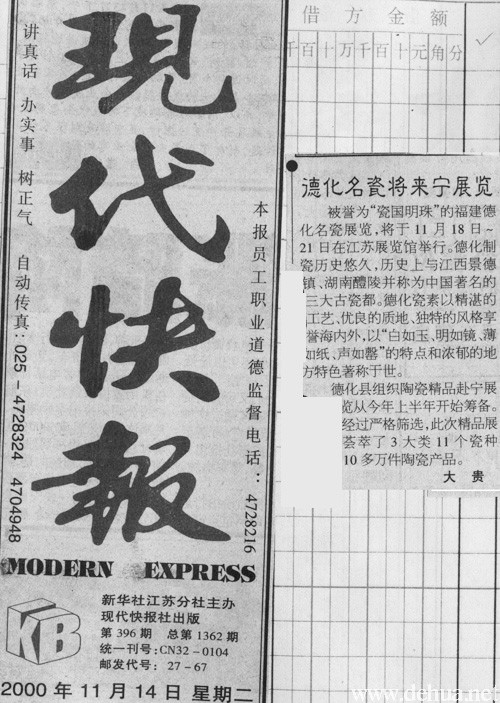 被譽為“瓷國明珠”的福建德化名瓷展覽,將于11月18日~21日在江蘇展覽館舉行。德化制瓷歷史悠久,歷史上與江西景德鎮(zhèn)、湖南醴陵并稱為中國著名的三大古瓷都。德化瓷素以精湛的工藝、優(yōu)良的質(zhì)地、獨特的風(fēng)格享譽海內(nèi)外,以“白如玉、明如鏡、薄如紙、聲如罄”的特點和濃郁的地方特色著稱于世。