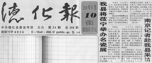 本報(bào)訊11月4—6日《南京日?qǐng)?bào)》副總編龔惠民、《金陵晚報(bào)》副總編戴中凱、《揚(yáng)子晚報(bào)》編委戴平、《家周刊》主編周建軍等南京各主要媒體負(fù)責(zé)人、記者一行到我縣采訪,為即將在南京舉辦的2000年南京·德化名瓷展覽會(huì),作好宣傳報(bào)道工作。