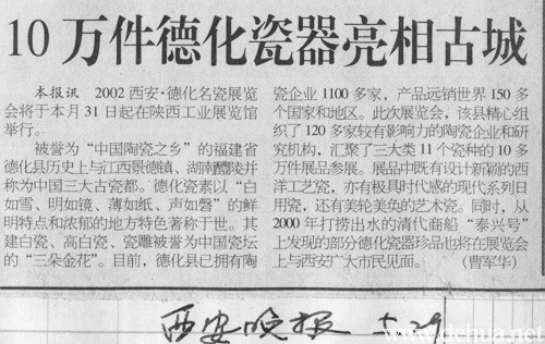 本報(bào)訊2002西安·德化名瓷展覽會將于本月31日起在陜西工業(yè)展覽館舉行。