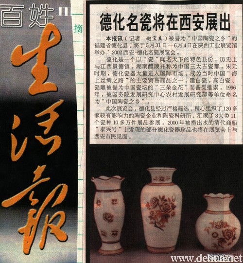 本報(bào)訊(記者趙寶良)被譽(yù)為“中國(guó)陶瓷之鄉(xiāng)”的福建省德化縣,將于5月31日一6月4日在陜西工業(yè)展覽館舉辦2002西安·德化名瓷展覽會(huì)。