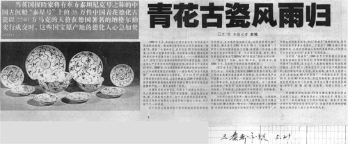 1999年5月,英國(guó)海上打撈專家邁克·哈徹在南中國(guó)海附近發(fā)現(xiàn)一艘清朝光緒年間沉沒(méi)的中國(guó)商船“泰星”號(hào),撈獲了大量的珍寶,其中包括35萬(wàn)件的德化瓷器,且大部分瓷器完好無(wú)損。這些瓷器大都是18世紀(jì)和19世紀(jì)初中國(guó)著名的三大古瓷都之…福建德化所生產(chǎn),并用于出口亞洲市場(chǎng)的明清時(shí)代青花瓷器。其中也有生產(chǎn)于更早年代的瓷器被發(fā)現(xiàn),有些甚至可追溯到15世紀(jì)。2000年,這位英國(guó)探險(xiǎn)家在德國(guó)斯圖加特城中心火車站展覽館花巨資建造了一座仿制的“泰星號(hào)帆船樓”,將這批瓷器進(jìn)行長(zhǎng)期展覽。并于11月17日至25日將其部分進(jìn)行拍賣,總成交額高達(dá)2240萬(wàn)德國(guó)馬克,僑居德國(guó)的福建德化籍華僑鄭德力博士獲悉后與這些瓷器的產(chǎn)地——德化縣取鑷了聯(lián)系。