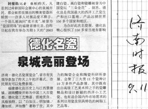 時(shí)報(bào)訊(記者 張彤)昨天,凡是到過舜耕國際會(huì)展中心的泉城市民,都會(huì)被那里展出的精美瓷器所傾倒——許多人對(duì)展品愛不釋手,一個(gè)勁兒地詢問“賣不賣”。被譽(yù)為“瓷國明珠”的福建省德化縣,自昨日起在我市舉辦為期5天的“2003濟(jì)南·德化名瓷展覽會(huì)”,省市有關(guān)領(lǐng)導(dǎo)參加了昨天上午的開幕式,市民朋友可以免費(fèi)參觀。