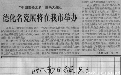 本報(bào)訊 被譽(yù)為“中國(guó)陶瓷之鄉(xiāng)”的福建德化市,將于9月10日至15日在舜耕國(guó)際會(huì)展中心舉辦2003濟(jì)南·德化名瓷展覽會(huì)。