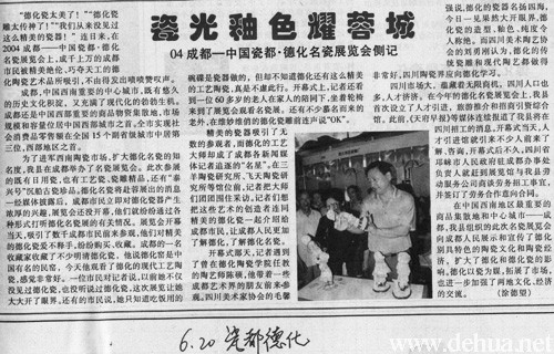 精美的瓷器吸引了無數(shù)的參觀者,而德化的工藝大師卻成了成都各新聞媒體記者追逐的“名星”。在三羊陶瓷研究所、飛天陶瓷研究所等館位前,記者把大師們團團圍住采訪。記者們想把這些藝術的創(chuàng)造者連同精美的德化瓷一起介紹給成都市民,讓成都人民更加了解德化,了解德化名瓷。
