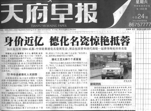 16日起亮相2004成都-中國(guó)瓷都德化名瓷展覽會(huì),展品包括曾和清代商船一起葬身海底的青花瓷