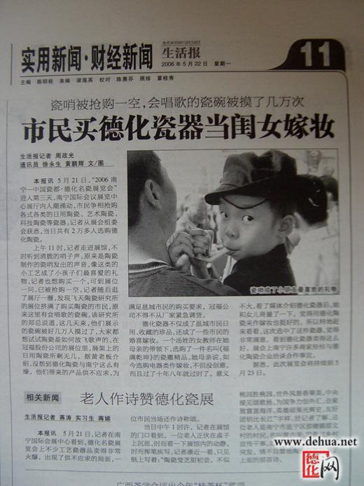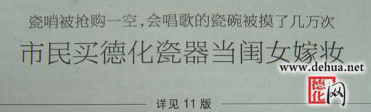德化瓷器不僅成了邕城市民日用、收藏的珍品,還成了一些市民的婚喜嫁妝。一個湯姓的女教師在她母親的帶領下,選購了一件名叫《福滿乾坤》的瓷雕精品。她母親說,如今選購電器類作嫁妝,不但沒創(chuàng)意,而且過了十年八年就過時了,意義不大,看了媒體介紹德化瓷器后,她和女兒商量了一下,覺得用德化陶瓷來作嫁妝也挺好的,所以特地趕來看看,這次選中了這件瓷器。覺得非常滿意?吹降禄沾善髻u得這么好,展會上南寧許多商家紛紛與德化陶瓷企業(yè)洽談合作事宜。