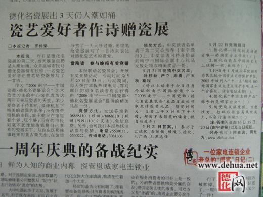 本報聯(lián)動名瓷展會,開展有獎競猜活動,活動時間為5月20日至23日;顒悠陂g,每天撥打本報熱線電話,答對題目的前5名讀者將會獲得由“2006南寧——中國瓷都·德化名瓷展覽會”提供的精美禮品一份。
