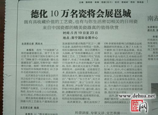 本報訊具有“中國瓷都”之稱的福建省德化縣,將于5月19日至23日在南寧國際會展中心舉行“2006南寧一中國瓷都·德化名瓷展覽會”。屆時,號稱中國一絕的德化白瓷、獨樹一幟的青花瓷、異軍突起的環(huán)保陶瓷等德化10萬多件名瓷將展現(xiàn)在市民眼前。
