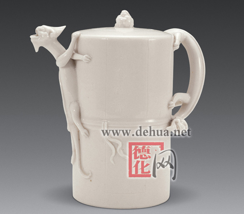 說明:直筒形,壺流,壺柄和壺蓋上的鈕均塑螭龍形,龍尾盤曲,壺體中央一揚起的結帶,自釉光潔滋潤,器形古典雅致,壺體陰刻西園墨翰。有窯風。