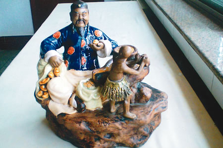 有錢能使鬼推磨:這件瓷塑人物像,造型準(zhǔn)確、比例恰當(dāng),不僅人物形象逼真,而且神氣活現(xiàn)。有錢者的訕笑,透出一種得意的內(nèi)心滿足,瘦骨如柴為利驅(qū)使的小鬼,又有不堪重負(fù)的無(wú)奈。為了錢,又有多少人能擺脫它的誘惑?