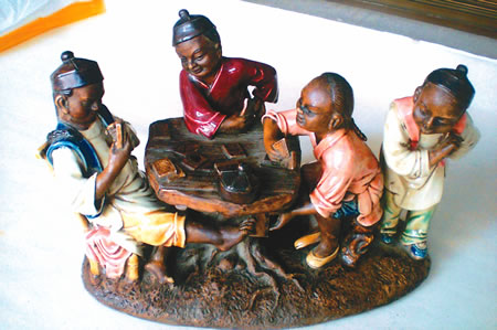 童趣:這組瓷塑人物像,一覽無(wú)余地構(gòu)造出兩個(gè)童子在玩牌過(guò)程中的串通手法,就是以桌子和帽子作遮掩,把對(duì)方所需要的牌用腳趾夾過(guò)去,而玩牌的第三方童子卻茫然不知,這一情景卻被站在旁邊的童子發(fā)現(xiàn)了。這件作品妙在瓷塑大師把這一瞬間定格下來(lái),表現(xiàn)出串通方童子的心機(jī)和巧妙。在現(xiàn)實(shí)生活中,不是也有不少人在演繹著類似的作弊手法嗎?