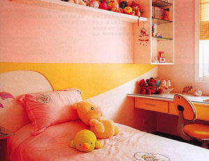 活潑、艷麗的色彩有助于塑造兒童開朗健康的心態(tài),還能改善室內(nèi)亮度,形成明朗親切的室內(nèi)環(huán)境。身處其中,孩子能產(chǎn)生安全感。粉紅、淡綠色、淡藍色都是很好的墻面裝飾色彩,太過亮麗的色彩只宜局部使用。