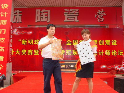 此次文化節(jié)秉承“創(chuàng)新、創(chuàng)意、設(shè)計(jì)”為主題,開幕式的舞臺(tái)搭建也別出心裁,舞臺(tái)全是用冠珠800×800㎜的瓷磚設(shè)計(jì)成獨(dú)特的T型舞臺(tái),其嶄新的創(chuàng)意設(shè)計(jì)為在場年輕設(shè)計(jì)人才帶來了一個(gè)新的啟發(fā)。同時(shí),伴隨著冠珠文化節(jié)的啟動(dòng),津門首支“磚業(yè)模特隊(duì)”閃亮出爐。這些行走在舞臺(tái)上的模特,都是非專業(yè)人士,他們是天津冠珠的營銷團(tuán)隊(duì)經(jīng)過數(shù)天訓(xùn)練的“磚業(yè)模特隊(duì)”,她們的表演融合了瓷磚創(chuàng)意與時(shí)裝藝術(shù),顛覆了傳統(tǒng)意義上在瓷磚秀場上的配角地位,成為此次設(shè)計(jì)創(chuàng)意的靈感源泉體現(xiàn) 。模特們手中的款款精品演繹著時(shí)尚浪漫的生活品味,T型臺(tái)上充滿激情的麗人、帥哥與瓷磚相映成趣。