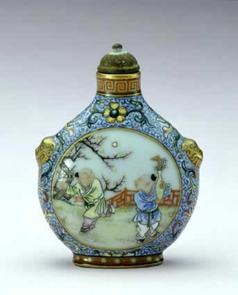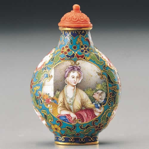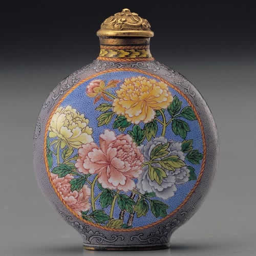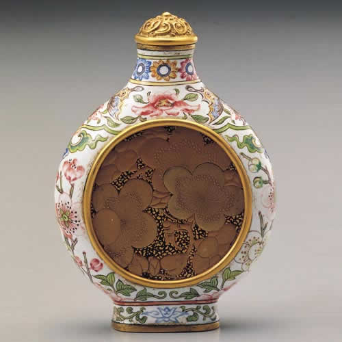 這一時期最出色的是琺瑯彩鼻煙壺。琺瑯器皿始于清康熙年間,清圣祖康熙非常喜愛琺瑯器皿,曾命琺瑯作燒造?滴跷迨四辏ü1719年)特邀法國畫琺瑯匠、傳教士陳忠信在養(yǎng)心殿造辦處琺瑯作傳授法國里摩日畫琺瑯技藝。