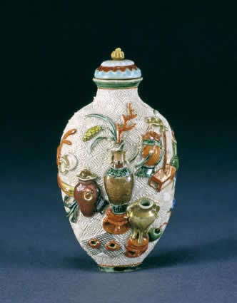清代盛行鼻煙,應(yīng)運而生的瓷制鼻煙壺也幾乎囊括了所有瓷器類別,斗彩、粉彩、五彩、祭紅、抹紅、珊瑚釉、茶葉末釉、墨彩、琺瑯彩、青花,釉里紅,哥瓷、雕瓷、刻瓷等等無所不有。造型最多的是爆竹筒式,也有方形、扁方,葫蘆形、圓形、瓜果形、雙聯(lián),人物形等。