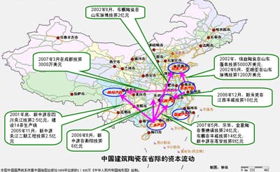 5月份,樂華、金意陶在景德鎮(zhèn)投資24億元;新中源在高安投資8億元;東鵬在豐城投資14億元。中國陶瓷行業(yè)跨產(chǎn)區(qū)的資本流動(配地圖1)從來沒有像今年這么頻繁,這么猛,始于2001年新中源在四川夾江投資的產(chǎn)業(yè)轉(zhuǎn)移到如今掀起高潮。