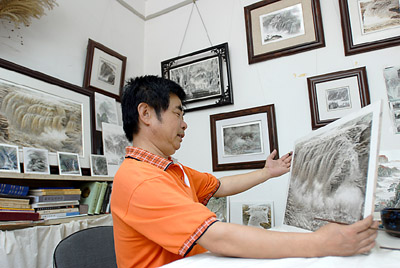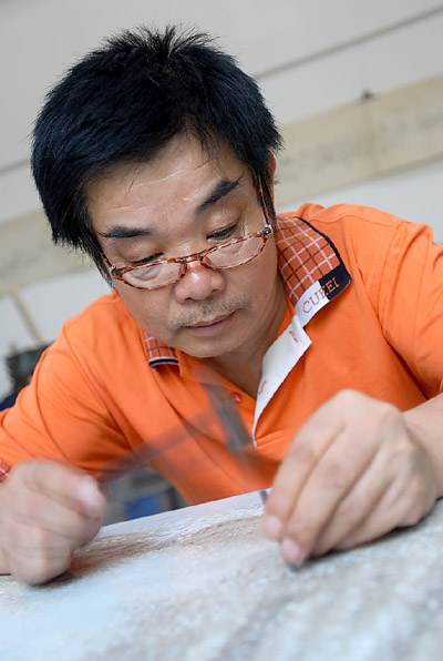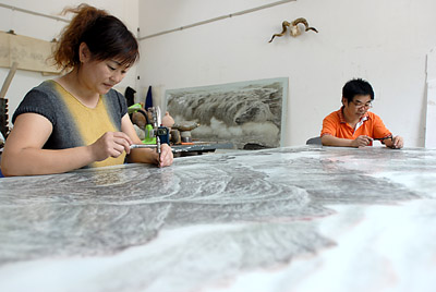 孫兆寶,山東省工藝美術(shù)大師,我市著名的刻瓷藝術(shù)家,1980年起從事刻瓷藝術(shù)創(chuàng)作。去年冬天,他設(shè)想要做一件世界上最大的刻瓷作品,他的這一想法得到淄博中國(guó)陶瓷館的大力支持,經(jīng)過(guò)短暫協(xié)商便開(kāi)始實(shí)施。黃河、泰山,是他的首選題材。寒冬臘月,他便來(lái)到黃河壺口和泰山之巔,頂著凜冽的寒風(fēng)去感受黃河的厚重與力量、泰山的雄壯與威嚴(yán)。從此他便全身心地投入到創(chuàng)作中去。面對(duì)長(zhǎng)2.6米,寬1.2米的巨大瓷板一時(shí)無(wú)從下手,他沒(méi)白沒(méi)黑地研究揣摩大型瓷板的刻制方法,經(jīng)過(guò)半年的時(shí)間,逐步形成了他自己獨(dú)特的刻瓷藝術(shù)語(yǔ)言。