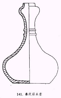蒜頭壺 始見于秦漢時(shí)期的一種壺式,有陶質(zhì)和原始青瓷兩種。特征為蒜頭形小口長頸,圓腹。東漢時(shí)期蒜頭壺腹部比西漢時(shí)期豐滿,蒜頭呈扁圓形。有的蒜頭壺頸、肩部堆塑有人物、龍、虎等紋飾。