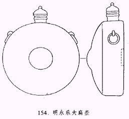 壺式之一,明永樂時(shí)期創(chuàng)燒。小直口,頸部凸起一棱,并有一小系,有蓋。壺身為立扁圓形,正面微鼓,中心有圓形凸臍;背面平坦,中有相應(yīng)的圓形凹臍。底部為弧面。左右肩部各有一活環(huán)系。均為青花制品。正面凸臍上多繪八角星紋,外圍有的繪纏枝蓮,邊緣為海水紋,側(cè)壁一周繪纏枝蓮紋。背面無紋飾。器形仿西亞金屬器皿,其用途有待考證。
