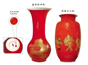 在發(fā)行現(xiàn)場(chǎng)看到,“奧運(yùn)瓷·中國紅”包括“鴻福齊天瓶——五福迎祥”和“盛世經(jīng)典瓶-長(zhǎng)城之魂”,均以中國紅高白玉瓷用毛瓷工藝燒制而成。“鴻福齊天瓶——五福迎祥”高48cm,福娃描金燈籠瓶,“盛世經(jīng)典瓶-長(zhǎng)城之魂”高56cm,長(zhǎng)城描金盤口瓶。它薈萃了眾多中國元素,“奧運(yùn)瓷·中國紅”采用了熱情喜慶而不失內(nèi)斂含蓄的“中國紅”,象征著中國;“盛世經(jīng)典瓶-長(zhǎng)城之魂”上巍峨的長(zhǎng)城象征著中國;“鴻福齊天瓶——五福迎祥”上活潑可愛的福娃象征著中國;瓷器身上的北京奧運(yùn)會(huì)徽——“中國印”象征著中國。