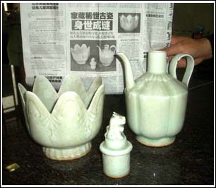 昨日上午,記者在鐘樓附近見到了肖先生及他收藏的這套古瓷。古瓷分為瓷壺和瓷碗兩部分,呈淺綠色,有暗紋,壺蓋的上方是一尊臥式坐獅,瓷碗的碗口直徑有15厘米左右,形似蓮花,共7片蓮花瓣。從外形上看,肖先生收藏的這套瓷壺和報(bào)紙上刊登的那套瓷壺幾乎一模一樣。