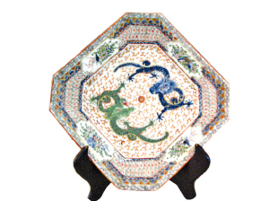 葉潔瑜老師從另兩位讀者發(fā)來的圖片中鑒定出,一件是光緒“青花花口葉紋盤”,另一件是光緒“廣彩雙龍方盤”。外銷瓷,指在中國(guó)生產(chǎn)、專門銷往國(guó)外的陶瓷器。歷史上出口的瓷器中,以景德鎮(zhèn)生產(chǎn)的青花瓷為最大宗。不過,廣州也發(fā)展了自己的瓷器品種。那就是獨(dú)具特色的“廣彩”。