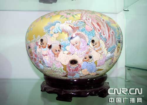熊璧如拿著一個名為“嬰戲圖”的水晶繡彩瓷制品對記者介紹,這個“嬰戲圖”就是經(jīng)過了三次燒成的,在第一次燒成型后,我要將人物的皮膚上填色后再進爐燒;等二次取出后我還要再將人物的臉部面容再次進行仔細勾畫填色后進爐,這樣三次進爐燒出來的瓷器,不僅人物造型會栩栩如生,而且整個構(gòu)圖也都更為豐滿。特別是從不同的角度會看到不同的藝術(shù)效果。