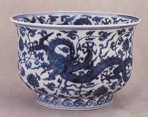 正德以回青燒造青花,色近似磚色,青花有淡描的畫(huà)法。除青花外,尚有黃、綠彩。正德的祭紅質(zhì)量也比較好。