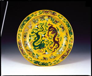 本次展出的器物種類繁多、釉彩齊全、別具一格,紋飾題材廣泛、吉祥如意。有體現(xiàn)皇家嚴(yán)明等級的后宮用瓷,在《國朝宮史》卷十七“經(jīng)費(fèi)一”中記載:里外全黃色為皇太后、皇后使用;里白外黃色為皇貴妃使用;黃地綠龍為貴妃、妃使用;藍(lán)地黃龍為嬪使用;綠地紫龍為貴人使用;五彩紅龍為常在使用;有工藝精湛的奇巧別致之作;有官窯的必須燒制的器物,像日常用的杯、碗、碟等,以及祭祀用瓷、賞賜用瓷等;有頗具仿古意韻的仿前朝窯口、青銅器、瓷器等的器物;有帶有瓷畫、花鳥畫風(fēng)格的器物等等,可以說是琳瑯滿目,美不勝收。