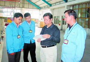 陳顯彬(右二)在生產(chǎn)車間與工人一起研究產(chǎn)品質量。